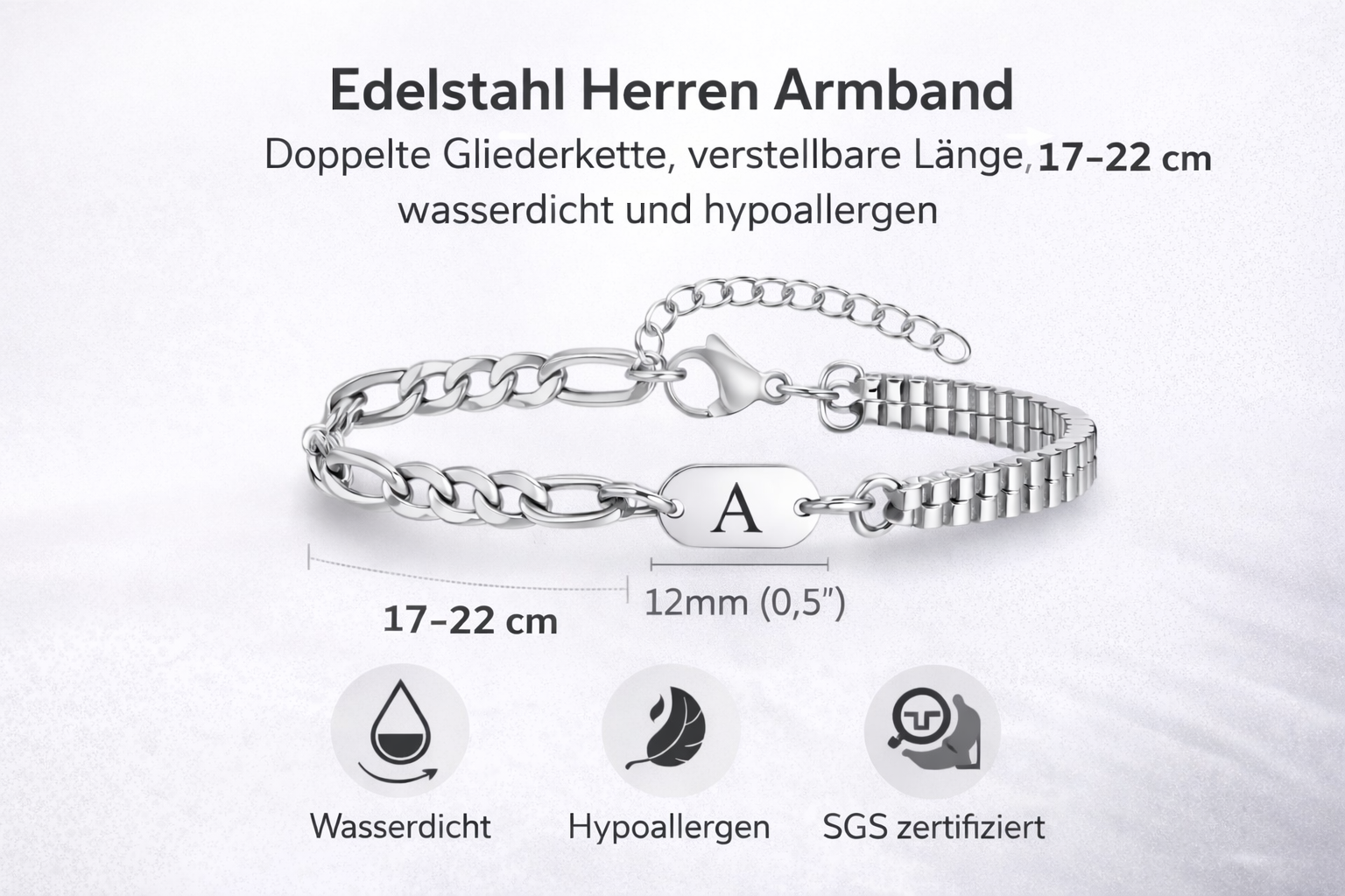 Dieses personaliserbare Herrenarmband aus hochwertigem Edelstahl vereint modernes Design mit langlebiger Qualität. Die Kombination aus doppelter Gliederkette – bestehend aus einer klassischen Kette und einer eleganten Box-Link-Kette – sorgt für einen maskulinen und zugleich stilvollen Look.